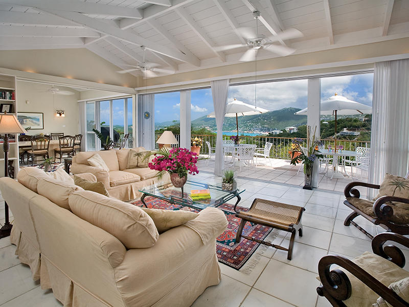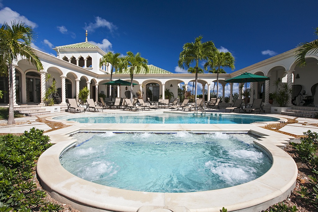 One of the top luxury properties available in the U.S. Virgin Islands, the 11,860-total-square-foot Villa Kismet is perched atop a prime knoll, offering 360-degree views of the Caribbean Sea, Great Cruz Bay, rolling green hillsides and sunrises and sunsets. Tilework by renowned artist Muhammed Benslimane of the Mosaic House, New York, lends a Moroccan ambience throughout the seven-bedroom villa.