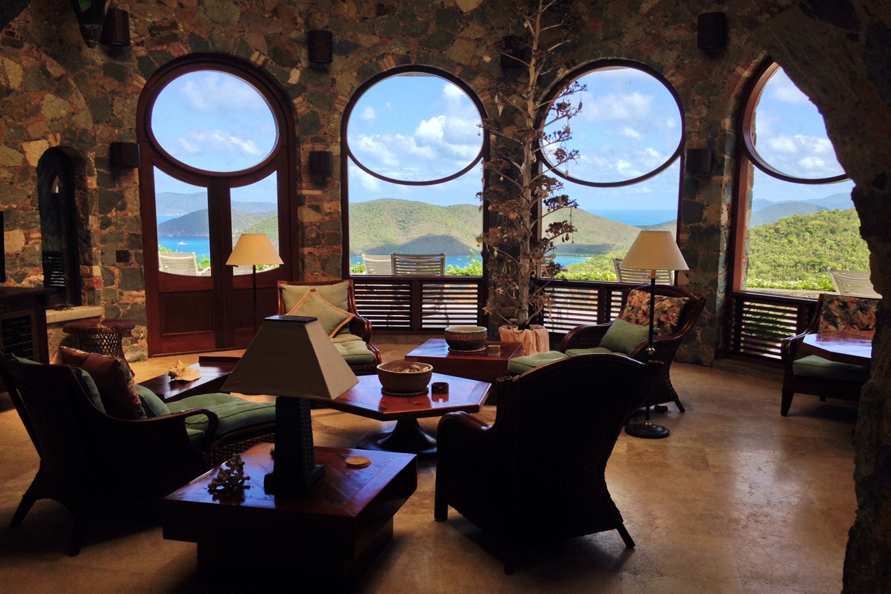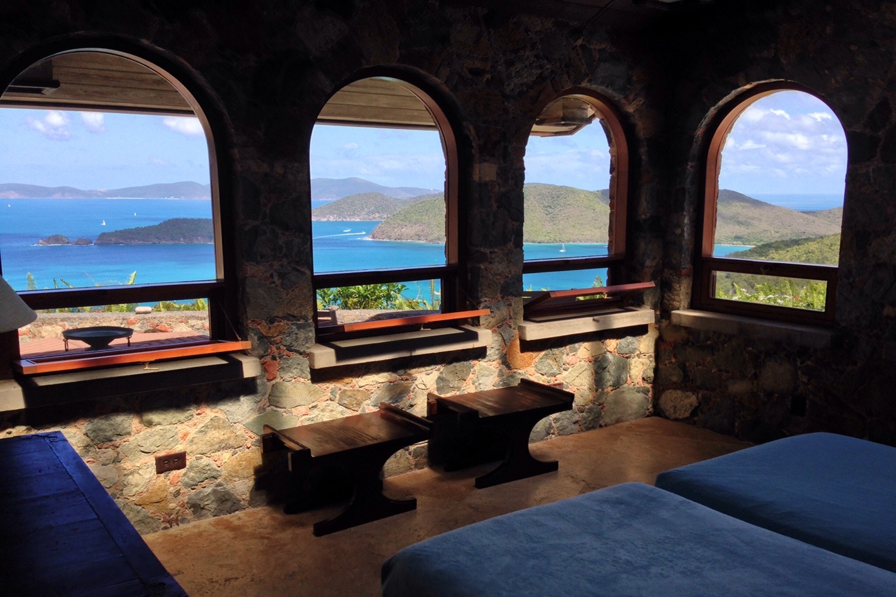 A rare opportunity in Estate Catherineberg that includes a second undeveloped 1.09 acre lot +/-. This spectacular Glenn Speer designed home, bordering National Park, has north shore views overlooking world famous Cinnamon Bay beach. The meticulous stone work with arches throughout the property, blend well with the natural landscape of St John. Spectacular north shore views can be found from every area of this villa without a neighbor in sight. Relax to the sound of the waves breaking on the beach below. The bonus fifth bedroom with a fifth full bathroom is a lower-unit caretakers apartment complete with its own separate entrance.