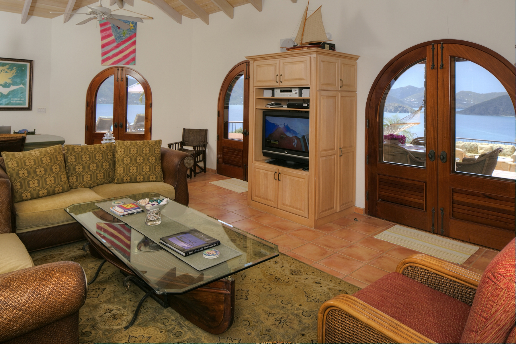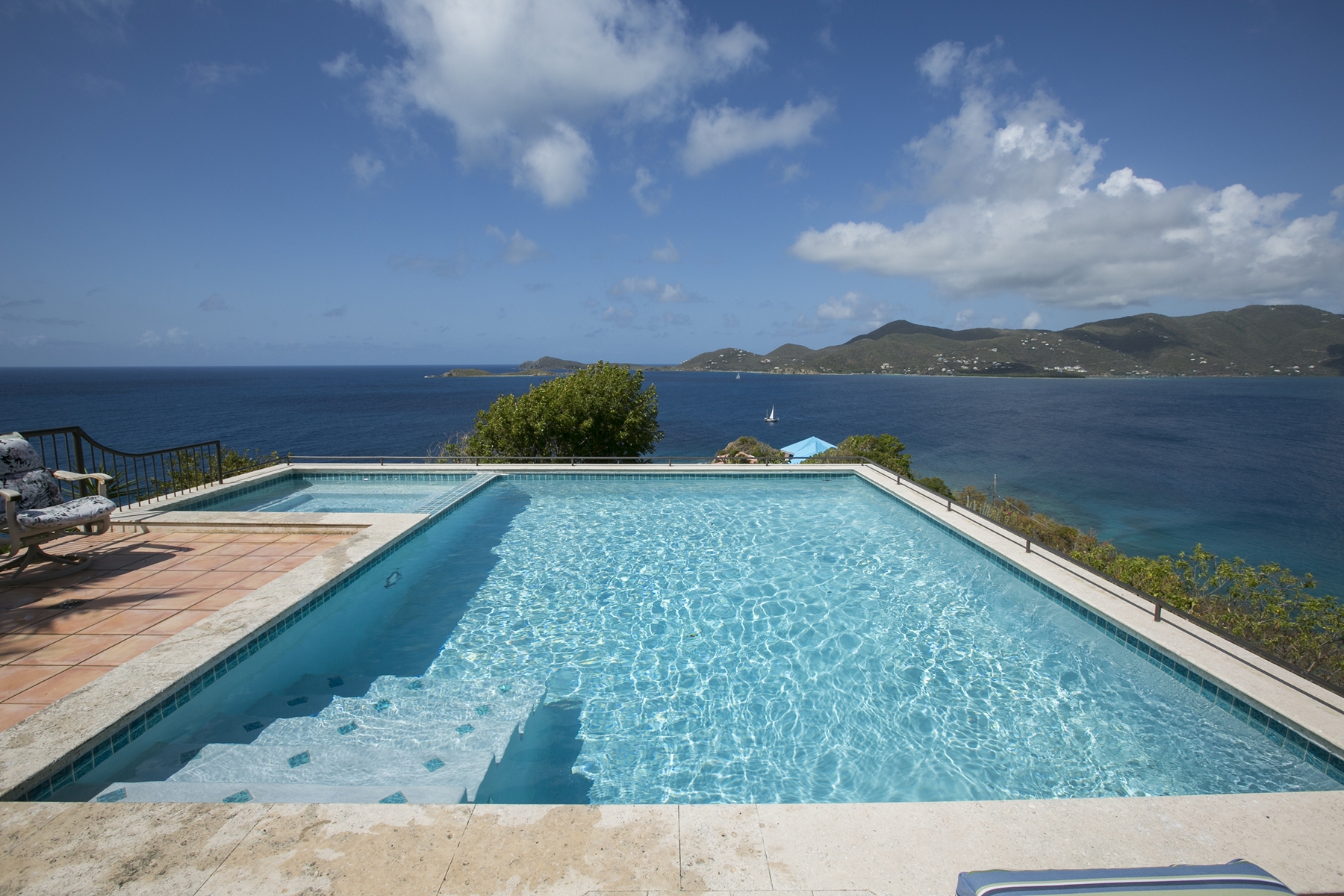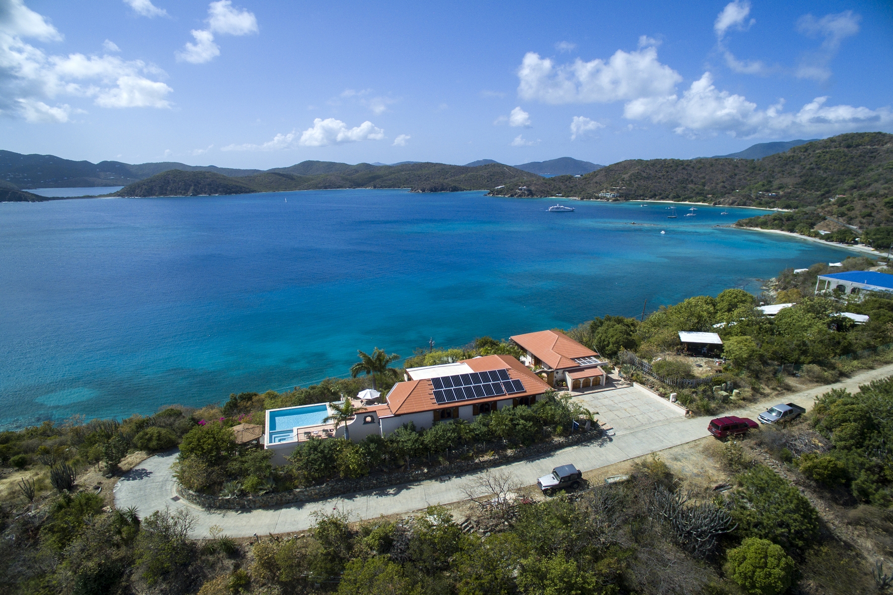 Perched high on a one-of-a-kind ridgetop parcel offering unobstructed 270 degree views of distant islands, tranquil waters and endlessly entertaining sunsets, Gin de Mer offers a panoramic like no other within St John’s magical East End neighborhood. The villa’s thoughtful design and tastefully chosen finishes provide a comfortably casual feel while offering all the requisite trappings one expects from a island home of this stature. The property will be delivered turnkey with solid masonry construction, custom mahogany doors/windows, professional landscaping, a rambling pool deck with hot tub, a 4.5 kW net metered solar array, four well appointed guest suites, high end appliances and deed access to the waterfront on Round Bay just a short walk away.